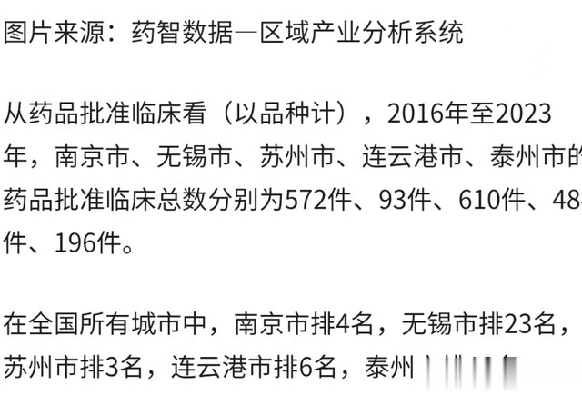 2024年医药申请临床数量的城市,苏州全国第3,仅次于北京上海,南京第4,连云港第6,泰州13,无锡排23名。